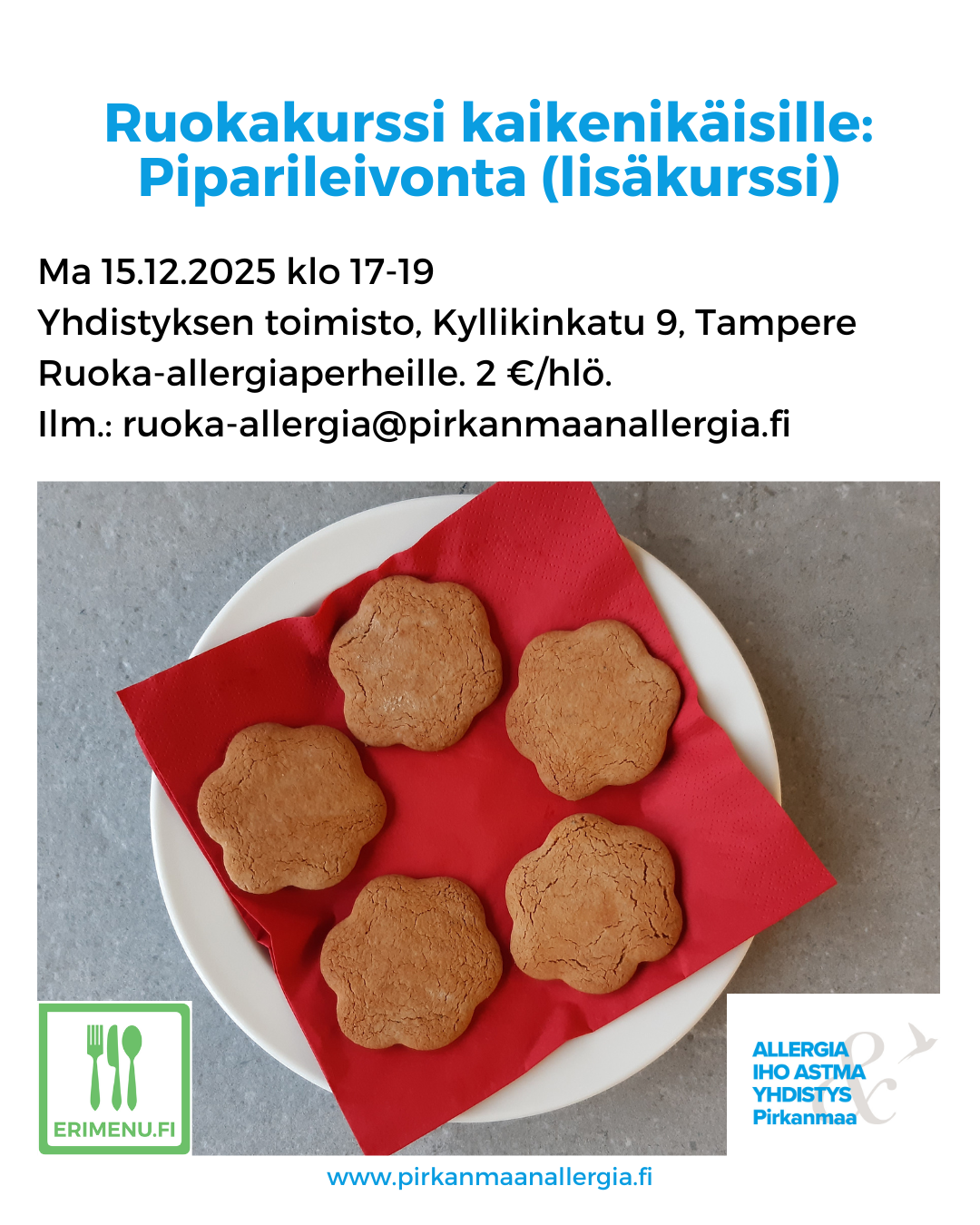 Jo perinteeksi muodostuneella ruoka-allergisten piparikurssilla kokoonnutaan yhteen leipomaan joulupipareita. Tarjolla on erilaisia taikinoita testattavaksi. Koska piparikurssi 2.12. tuli täyteen niin…