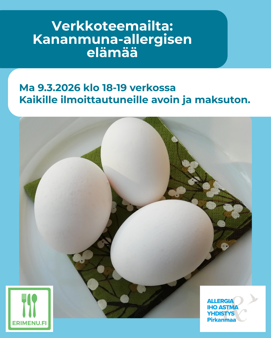 Illan aiheena on kananmuna-allergia. Miten se vaikuttaa arkeen? Missä tilanteissa voi käydä vahinko ja mitä siitä voi oppia? Mitä munattomia luottotuotteita kaupasta on löytynyt? Tule jakamaan ja…