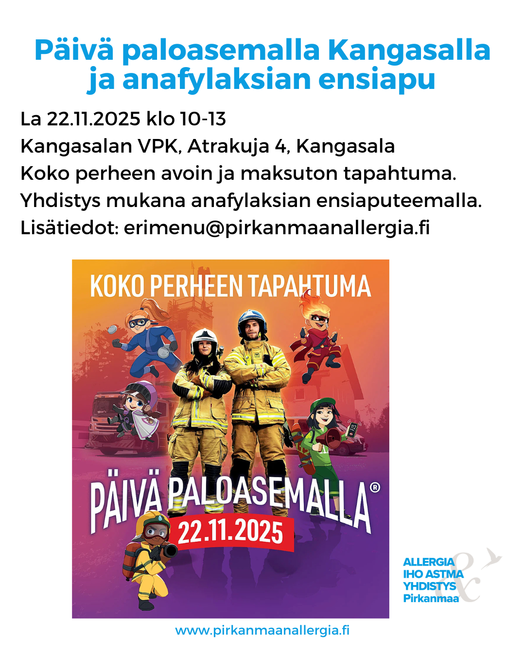 Yhdistyksemme edustaja on mukana Päivä paloasemalla -tapahtumassa Kangasalla. Pisteellämme kuulet hengenvaarallisesta allergiareaktio anafylaksiasta ja pääset harjoittelemaan ensiapua…