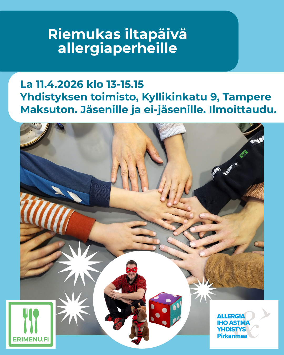Tule viettämään iloista iltapäivähetkeä yhdessä toisten allergiaperheiden kanssa! Klo 13–14.30 pääsee kiertämään monipuolisia toimintapisteitä. Pisteillä on mm. askartelua, käsitöitä, bingoa, pakohuone ja ulkona temppurata. Klo 14.30 esiintyy SuperSam, jonka liikunnallinen ja osallistava ohjelma nostaa tunnelman kattoon. SuperSam on Suomen ensimmäinen supersankari, jonka päätyö on olla supersankari!